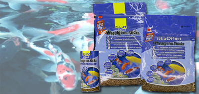 Answer: Tetra Wheatgerm. When water temperature is 5-10 degrees C, pond keepers should be feeding Tetra Wheatgerm Sticks. Wheatgerm sticks are easy to eat and digest, Fibre Rich and support a healthy immune system.
